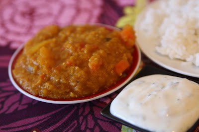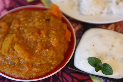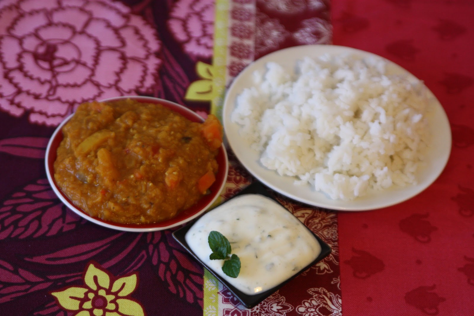 Einfach die Minze sehr fein hacken und unter den Joghurt rühren, mit Salz und Pfeffer und ein wenig Koriander und Kreuzkümmel abschmecken. Der Joghurt wird kalt dazu serviert und mildert die Schärfe des Currys ab.