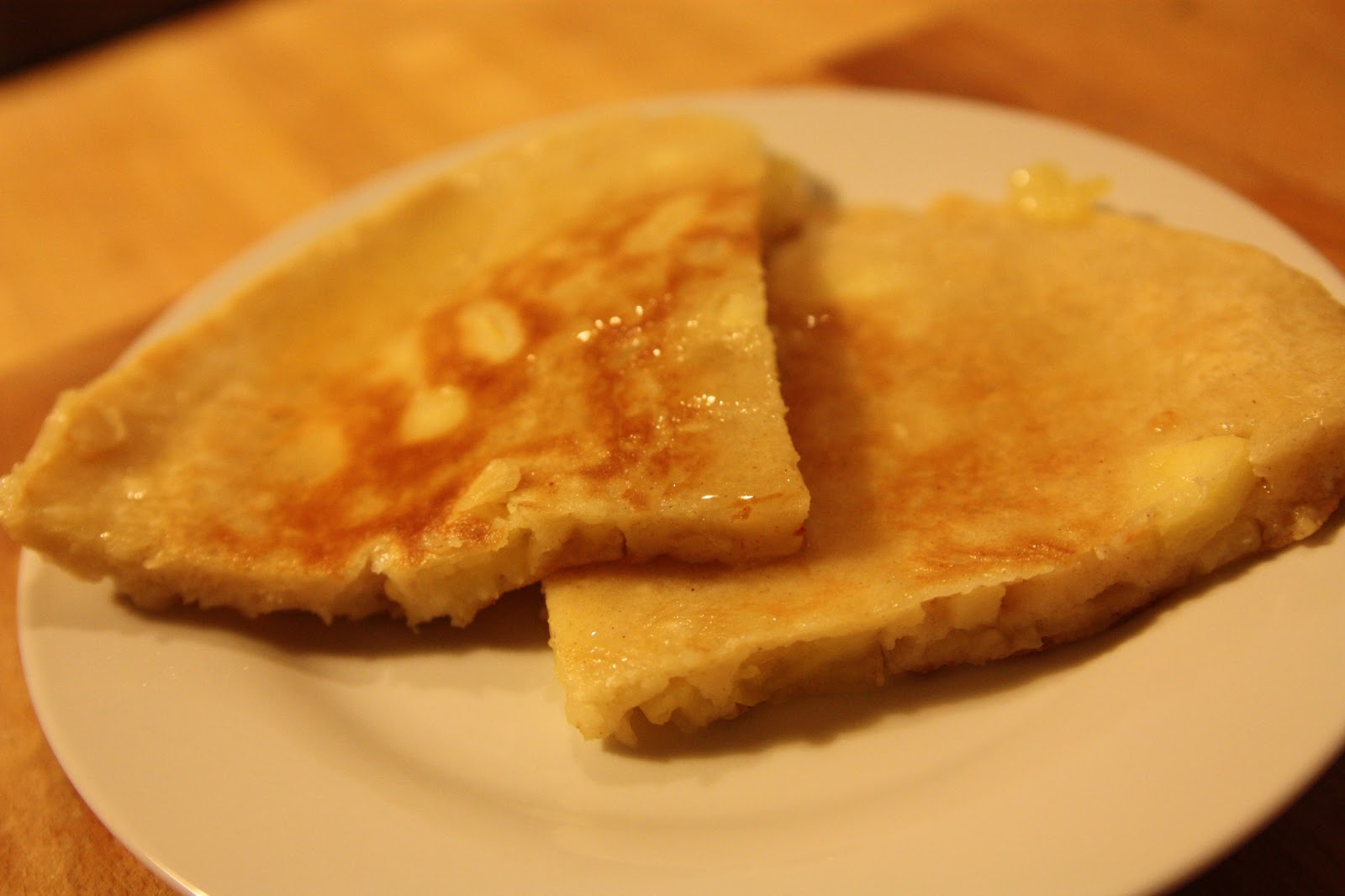 Den Apfel schälen und in kleine Stückchen schneiden, in den Teig geben und unterrühren. Dann den Teig in die Pfanne gießen, von beiden Seiten leicht braun werden lassen, mit Agavendicksaft beträufeln. Das ganze wird dann richtig schön schlotzig… Wer möchte kann natürlich auch Honig oder Zucker drübergeben.