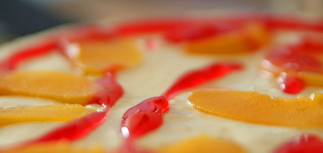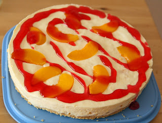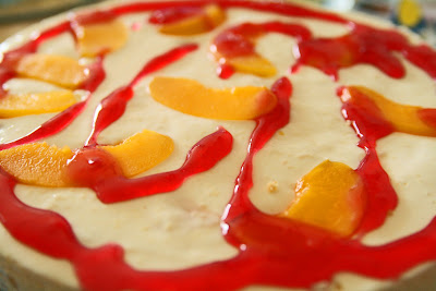 Pfirsiche abtropfen lassen, Saft auffangen, 150g Pfirsiche fein pürieren. 150ml Pfirsichtsaft mit 50ml Wasser verrühren, Gelatine darin 10 Minuten einweichen lassen. In der Zeit die übrigen Pfirsiche in Stücke schneiden (evtl. bis auf einen zur Garnierung). Dann auf dem Herd unter rühren erwärmen und den Zucker dazugeben, bis sich alles gelöst hat. Die pürierten Pfirsichen dazugeben und die Masse löffelweise unter Rühren zur Frischkäsecreme geben. Pfirsichstücke unterheben und dann alles auf den Tortenboden in der Springform geben, mit Pfirsichstücken garnieren. Dann den Kuchen 3 Stunden (mindestens 2) kalt stellen.
