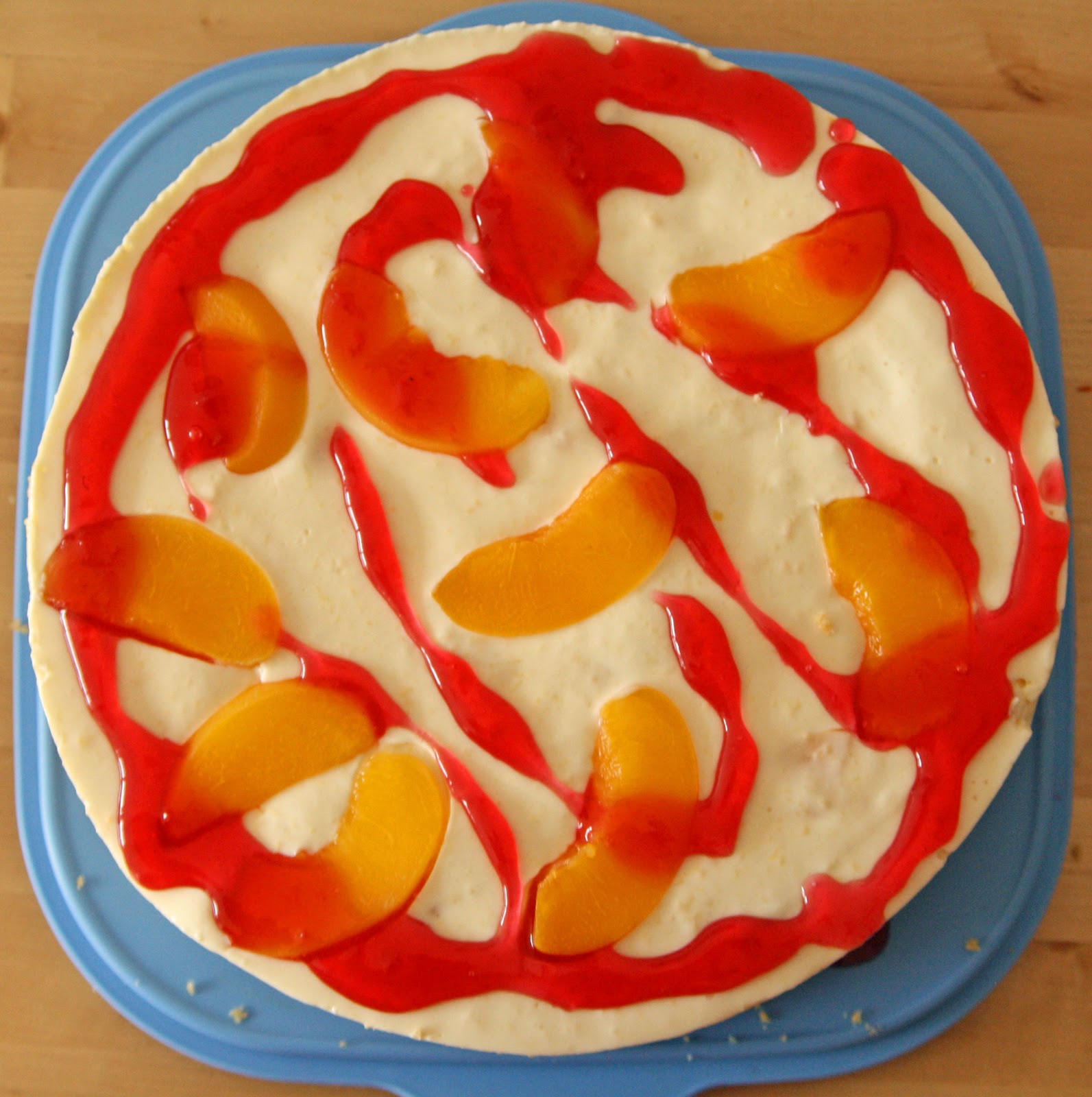Pfirsiche abtropfen lassen, Saft auffangen, 150g Pfirsiche fein pürieren. 150ml Pfirsichtsaft mit 50ml Wasser verrühren, Gelatine darin 10 Minuten einweichen lassen. In der Zeit die übrigen Pfirsiche in Stücke schneiden (evtl. bis auf einen zur Garnierung). Dann auf dem Herd unter rühren erwärmen und den Zucker dazugeben, bis sich alles gelöst hat. Die pürierten Pfirsichen dazugeben und die Masse löffelweise unter Rühren zur Frischkäsecreme geben. Pfirsichstücke unterheben und dann alles auf den Tortenboden in der Springform geben, mit Pfirsichstücken garnieren. Dann den Kuchen 3 Stunden (mindestens 2) kalt stellen.